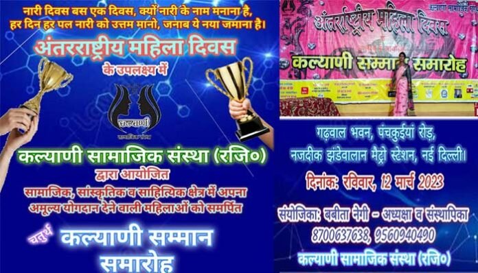 कल्याणी सम्मान 2023: विगत वर्षों की भांति इस वर्ष भी कल्याणी सामाजिक संस्था द्वारा अंतर्राष्ट्रीय महिला दिवस के उपलक्ष्य में आगामी 12 मार्च 2023 को गढ़वाल भवन नई दिल्ली में एक भव्य सम्मान समारोह आयोजित किया जा रहा है। यह कार्यक्रम उन महिलाओं के सम्मान में है, जिन्होंने विकट परिस्थितियों से लड़़कर समाज में एक इतिहास रचा, जो लगातार अपने कार्यो से प्रेरणा बनी। देश व समाज के लिए, उसी मातृशक्ति में नई ऊर्जा प्रवाहित करने के लिए लगातार चौथी बार महिलाओं द्वारा इस सम्मान समारोह का आयोजन किया जा रहा है। कार्यक्रम में मुख्य अतिथि ले अलावा विशिष्ट अतिथि होंगे।
