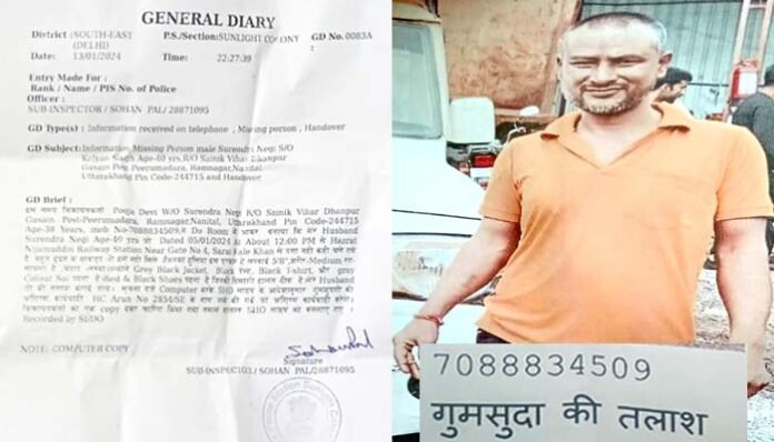 नई दिल्ली: दिल्ली के निजामुद्दीन से बीते 5 जनवरी को लापता हुए पौड़ी गढ़वाल के राठ क्षेत्र (थलीसैंण)के रौली गांव निवासी सुरेंद्र सिंह नेगी पुत्र स्वर्गीय कल्याण सिंह नेगी अब तक कोई सुराग नहीं मिल पाया है। समाजसेवी उदय ममगांई राठी ने बताया कि राठ क्षेत्र के ग्राम रौली पट्टी चोपड़ा कोट थलीसैंण, ज़िला पौड़ी गढ़वाल के मूल निवासी सुरेंद्र सिंह नेगी बीती 5 जनवरी 2024 से दिल्ली के निजामुद्दीन से लापता हैं। काफी खोजबीन के उपरांत 13 जनवरी 2024 को साउथ दिल्ली के सन लाइट कलोनी थाने में उनकी गुमसुदगी की रिपोर्ट दर्ज करवाई गई। साथ ही विभिन्न सामाजिक संगठनों तथा पुलिस अधिकारियों को भी इस संबंध में सूचित किया गया है।