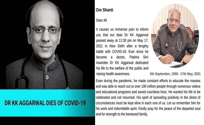 डॉ. के के अग्रवाल के निधन की जानकारी उनके ट्विटर हैंडल से ही साझा की गई। उनके ट्विटर हैंडल पर किए गए ट्वीट में लिखा गया, ‘काफी दुख के साथ सूचित किया जा रहा है कि डॉ. केके अग्रवाल का 17 मई की रात 11.30 बजे के करीब कोरोना से लंबी लड़ाई लड़ते हुए निधन हो गया।