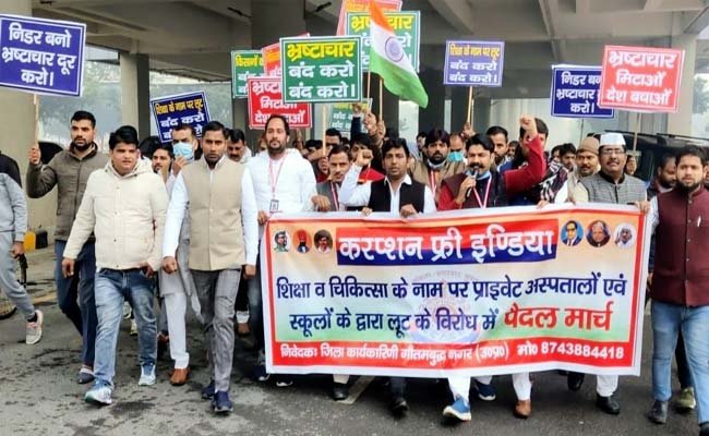 ग्रेटर नोएडा : गौतमबुद्ध नगर के स्थानीय किसानों को शिक्षण संस्थानों व अस्पतालों में छूट दिए जाने की मांग को लेकर सामाजिक संगठन के कार्यकर्ताओं ने बुधवार को पैदल मार्च किया। कार्यकर्ताओं ने हल्ला बोल प्रदर्शन कर ग्रेटर नोएडा प्राधिकरण के ओएसडी को ज्ञापन सौंपा। मांग पूरी न होने पर भूख हड़ताल की चेतावनी दी है। करप्शन फ्री इंडिया संगठन के संस्थापक प्रवीण भारतीय का कहना है कि यहां स्थित शिक्षण संस्थानों एवं अस्पतालों को इस शर्त पर सस्ते दामों पर जमीन दी थी कि स्थानीय किसानों एवं शहर के लोगों को शिक्षा व चिकित्सा सुविधाएं सस्ते दामों पर एवं निशुल्क उपलब्ध कराई जाएगी। लेकिन अस्पताल एवं शिक्षण संस्थानों ने पिछले ढाई दशकों से लोगों को कोई लाभ नहीं दिया। इसको लेकर लोगों में रोष है। इस मुद्दे को प्राधिकरण अधिकारियों के सामने रखा गया, लेकिन स्थानीय निवासियों को लाभ नहीं मिला।  उनका कहना है कि ग्रेटर नोएडा प्राधिकरण के द्वारा सैकड़ों शिक्षण संस्थानों एवं अस्पतालों को भूखंड सस्ते दरों पर जमीन आवंटित की गई है। शिक्षण संस्थानों व अस्पताल प्रबंधन द्वारा लगातार शर्तों का उलंघन किया जा रहा है, लेकिन उनके खिलाफ कोई कार्रवाई नहीं की जा रही है। चौधरी प्रवीण भारतीय ने कहा कि लीज डीड के अनुसार प्रत्येक अस्पताल में 2 घंटे सुबह व 2 घंटे शाम लोगों के लिए ओपीडी फ्री रखनी होनी चाहिए। प्रत्येक स्कूल को स्थानीय किसानों के बच्चों के लिए ट्यूशन फीस में 25 फीसद छूट मिलनी चाहिए एवं सालाना फीस के नाम पर कोई भी अतिरिक्त शुल्क नहीं लिया जाना चाहिए। इस संबंध में संगठन के द्वारा कई बार ज्ञापन देकर लीज डीड के अनुसार सभी शर्तों को मनवाने की मांग की थी, लेकिन अभी तक कोई भी कार्यवाही नहीं हुई है। शिक्षण संस्थान व अस्पताल प्रबंधन की तानाशाही एवं प्राधिकरण के अधिकारियों की लापरवाही को देखते हुए संगठन एवं ग्रामीण क्षेत्र के लोगों में काफी रोष व्याप्त है। कार्यकर्ताओं ने चेतावनी दी है यदि मांग पूरी नहीं हुई तो भूख हड़ताल की जाएगी।