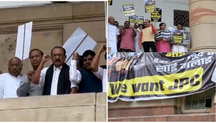 इस प्रदर्शन के बाद ही दोनों सदनों को 2 बजे तक स्थगित कर दिया गया। विपक्ष ने इसके बाद संसद के बाहर बवाल किया। उसके बाद कांग्रेस समेत विपक्षी सांसद संसद की पहली मंजिल पर चढ़ गए। अडानी मामने पर जेपीसी मांग को लेकर विपक्षी दलों के नेताओं ने संसद की पहली मंजिल पर विरोध प्रदर्शन किया और पोस्टर लहराए। सभी सांसदों के हाथ में बैनर-पोस्टर था। वे अडानी-हिंडनबर्ग रिपोर्ट पर संसद की जॉइंट पार्लियामेंट्री कमेटी की मांग को लेकर नारेबाजी कर रहे थे।