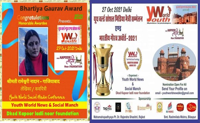 यूथ वर्ल्ड सोशल मंच के नेशनल एडवाइजर डॉ सुरेन्द्र गोयल ने बताया की मंच द्वारा दिल्ली में आयोजित होने वाले इस भव्य समारोह में गाजियाबाद से लेखिका और कवियत्री रामेश्वरी नादान के नाम का चयन भी किया गया है और उन्हें आयोजन में भारतीय गौरव अवॉर्ड 2021 से सम्मानित किया जाएगा।