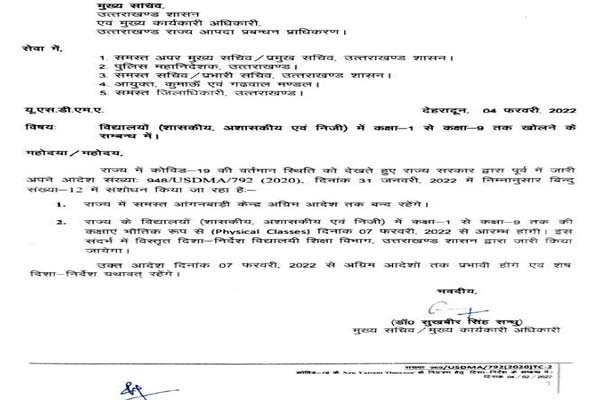 शिक्षा विभाग द्वारा जारी विस्तृत आदेश के मुताबिक छात्र-छात्राओं के शैक्षिक हितों के दृष्टिगत शासन स्तर पर सम्यक विचारोपरान्त कक्षा 01 से 09 तक के समस्त शिक्षा बोर्डों के शिक्षण संस्थानों को भी भौतिक रूप दिनांक 07 फरवरी 2022 से पठन-पाठन हेतु खोले जाने की अनुमति प्रदान की जाती है। राज्य के समस्त शिक्षा बोर्डो / संस्थाओं के समस्त कक्षाओं के भौतिक रूप से संचालन के दौरान दिशा-निर्देशों / मानक संचालन प्रक्रिया (SOP) का अनुपालन अनिवार्य रूप से सुनिश्चित किया जायेगा।