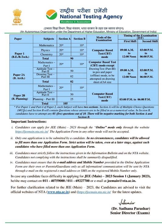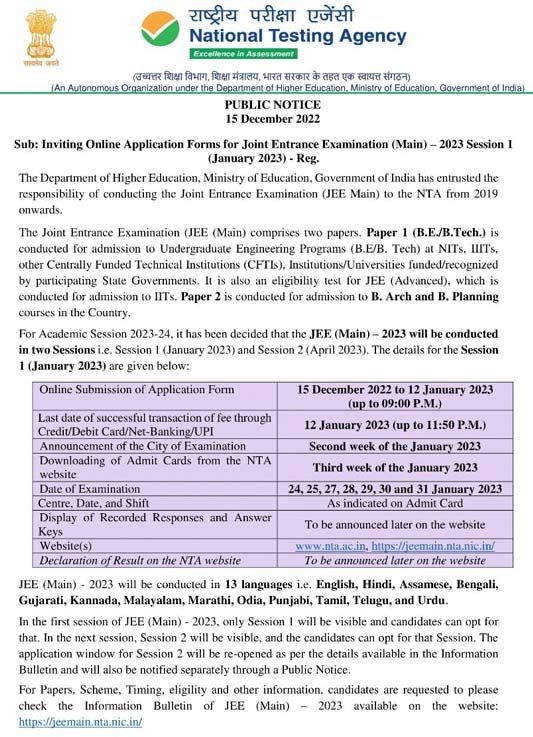 राष्ट्रीय परीक्षण एजेंसी के मुताबिक, स्टूडेंट्स जेईई-मेन 2023 के लिए आवेदन 15 दिसंबर से लेकर 12 जनवरी 2023 तक कर सकेंगे। छात्र इसके आफिशियल वेबसाइट jeemain.nta.nic.in पर जाकर आवेदन कर सकते हैं। राष्ट्रीय परीक्षण एजेंसी ने कहा कि इसका दूसरा सत्र अप्रैल में होगा। राष्ट्रीय परीक्षण एजेंसी द्वारा जारी नोटिफिकेशन के मुताबिक, परीक्षा का आयोजन 24, 25, 27, 28, 29, 30, और 31 जनवरी 2023 को किया जाएगा। गणतंत्र दिवस के दिन परीक्षा का आयोजन नहीं की जाएगी। एनटीए ने बताया कि परीक्षा के लिए रजिस्ट्रेशन प्रक्रिया शुरू हो गया है।