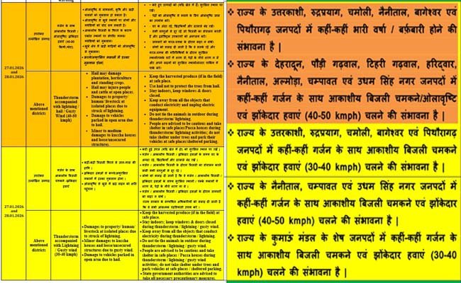 मौसम विभाग ने 27 जनवरी को उत्तरकाशी, चमोली, रुद्रप्रयाग, अल्मोड़ा, बागेश्वर और पिथौरागढ़ जिलों के लिए येलो अलर्ट जारी है। वहीं 28 जनवरी के लिए उत्तरकाशी, टिहरी गढ़वाल, पौड़ी गढ़वाल, चमोली, रुद्रप्रयाग, देहरादून, हरिद्वार, अल्मोड़ा, बागेश्वर और पिथौरागढ़ जिलों के लिए येलो अलर्ट जारी है। 29 जनवरी को उत्तरकाशी, रुद्रप्रयाग, चमोली, बागेश्वर और पिथौरागढ़ जिलों में हल्की बारिश और बर्फबारी का पूर्वानुमान है। बाकी जिलों में मौसम शुष्क रहेगा।