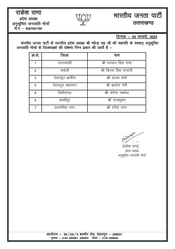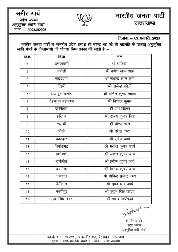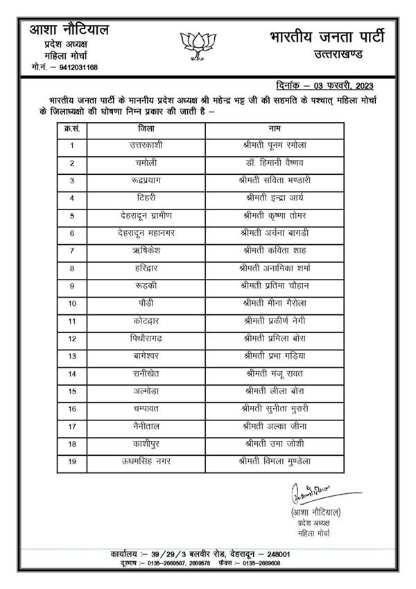 भारतीय जनता पार्टी के प्रदेश नेतृत्व ने शुक्रवार को उत्तराखंड के विभिन्न जनपदों के लिए भारतीय जनता युवा मोर्चा, महिला मोर्चा, किसान मोर्चा, अनुसूचित जाति मोर्चा, अनुसूचित जनजाति मोर्चा, अन्य पिछड़ी जाति मोर्चा व अल्पसंख्यक मोर्चा सहित सभी मोर्चों के जिलाध्यक्षों की घोषणा कर दी है।