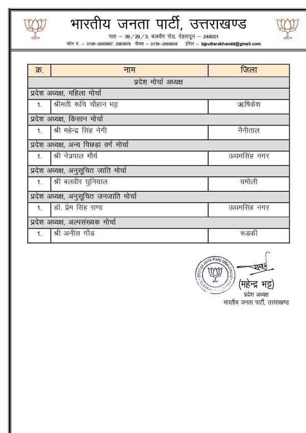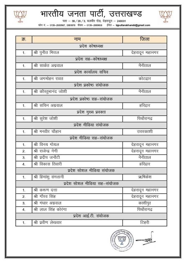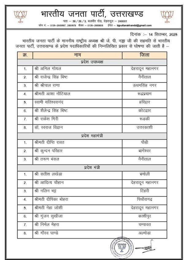 Uttarakhand BJP state office bearers: उत्तराखंड भाजपा ने प्रदेश पदाधिकारियों की घोषणा कर दी है। भाजपा प्रदेश अध्यक्ष महेंद्र भट्ट के निर्देश पर संगठन के विभिन्न मोर्चो और विभाग मे 42 लोगों को दायित्व दिये गए है। दीप्ति रावत, कुंदन परिहार और तरुण बंसल को महामंत्री बनाया गया है।