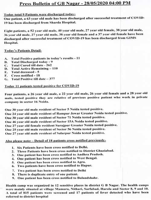 ग्रेटर नोएडा : उत्तर प्रदेश के गौतमबुद्धनगर जिले में कोरोना संक्रमण के मामले बढ़ते जा रहे हैं। गुरुवार को जिले में कोरोना के 11 नये मामले सामने आये हैं। जिनमे से 04 कोरोना संक्रमित मरीज नोएडा के सेक्टर-16 स्थित एक निजी कंपनी से संबंधित हैं। जिसके बाद जिले में अब कोरोना पॉजिटिव मरीजों का आंकड़ा 377 पहुंच गया है। वहीं बृहस्पतिवार को 09 मरीज स्वस्थ होकर डिस्चार्ज भी हुए हैं।