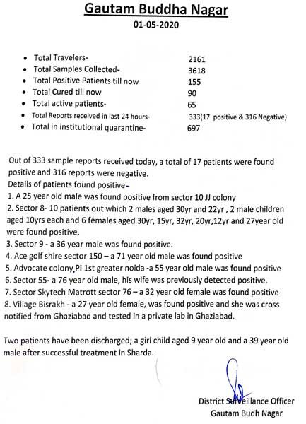 नोएडा : गौतमबुद्ध नगर जनपद में कोरोना को लेकर बुरी खबर है। शुक्रवार को जिले के नोएडा/ग्रेटर नोएडा क्षेत्र से कोरोना वायरस (COVID-19) के 17 नए मामले सामने आए। इनमे से अकेले 15 मामले नोएडा के विभिन्न सेक्टरों के, एक बिसरख गाँव का तथा एक ग्रेटर नोएडा के पाई-1 सेक्टर का है। जिसके बाद अब जिले में कोरोना के मरीजों की संख्या बढ़कर 155 हो गई है। जिला सर्विलांस अधिकारी सुनील दोहरे ने बताया कि शुक्रवार को कोरोना वायरस के 333 संदिग्ध मरीजों की जांच रिपोर्ट प्राप्त हुई, जिनमें 316 लोगों की रिपोर्ट नेगेटिव आई है जबकि 17 लोगों में कोरोना वायरस की पुष्टि हुई है।