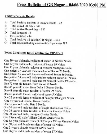 ग्रेटर नोएडा : गौतमबुद्ध नगर जिले में कोरोना संक्रमण के मामले रुकने का नाम नहीं ले रहे हैं। गुरुवार को नोएडा/ग्रेटर नोएडा सहित जिले में कोरोना वायरस के 22 नए मामले सामने आये। जिसके बाद गौतमबुद्ध नगर जनपद में कोरोना मरीजों की संख्या बढ़कर 543 तक पहुंच चुकी है। हालाँकि अब तक 348 लोग इलाज के बाद स्वस्थ होकर घर लौट चुके हैं। जबकि 8 लोगों की मौत हो चुकी है। स्वास्थ्य विभाग की ओर से गुरुवार को जारी हेल्थ बुलेटिन के अनुसार पिछले 24 घंटों के दौरान नोएडा, ग्रेटर नोएडा सहित जनपद में 22 नए लोगों में कोरोना वायरस की पुष्टि हुई है। जिसके बाद अब जिले में कोरोना संक्रमितों की संख्या बढ़कर 543 हो गई है।