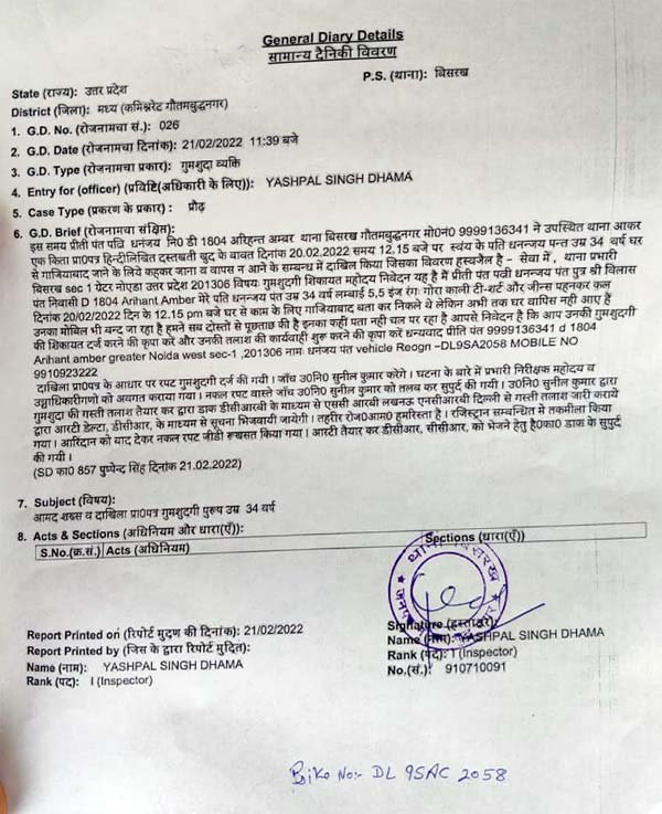 ग्रेटर नोएडा वेस्ट: बिसरख कोतवाली के अंतर्गत ग्रेटर नोएडा वेस्ट से एक युवक की गुमशुदगी का मामला सामने आया है। प्राप्त जानकारी के मुताबिक ग्रेटर नोएडा वेस्ट की अरिहंत एम्बर सोसाइटी में 34 वर्षीय धनंजय पंत अपनी पत्नी के साथ रहते हैं। 20 फरवरी को दोपहर सवा 12 बजे वह किसी काम से अपनी पल्सर बाइक से गाजियाबाद के लिए घर से निकले थे। इसके बाद वह घर नहीं लौटे। देर शाम तक भी उनके घर न लौटने पर उनकी पत्नी ने उनकी तलाश शुरू की मगर कोई जानकारी नहीं मिली। धनंजय का फोन भी स्विच ऑफ जा रहा है। सभी दोस्तों तथा रिश्तेदारों से पूछने के बाद भी जब धनंजय की कोई जानकारी नहीं मिली तो अगले दिन सुबह धनंजय की पत्नी प्रीति ने बिसरख कोतवाली में अपने पति की गुमशुदगी दर्ज कराई है।