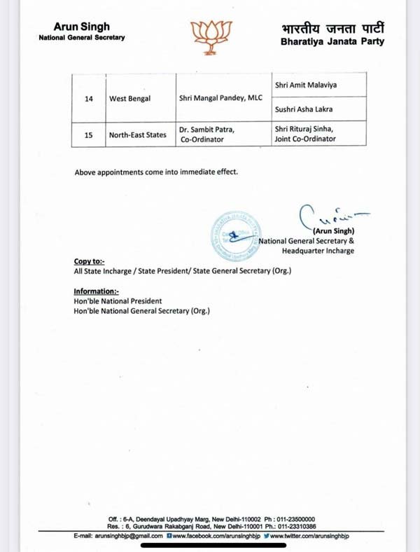 तेलंगाना का प्रभारी तरुण चुघ को बनाया गया है। वहीं अरविंद मेनन को तेलंगाना का सह प्रभारी नियुक्त किया गया है। बीजेपी ने राजस्थान का प्रभारी सांसद अरुण सिंह को बनाया है। राजस्थान में विजया रहाटकर सह प्रभारी होंगे। त्रिपुरा का प्रभारी सांसद महेश शर्मा को बनाया है। चंडीगढ़ का प्रभारी विजय भाई रुपाणी को बनाया है। नार्थ ईस्ट प्रदेश में संबित पात्रा को संजोयक नियुक्त किया है और सह संयोजक रितुराज सिन्हा होंगे।