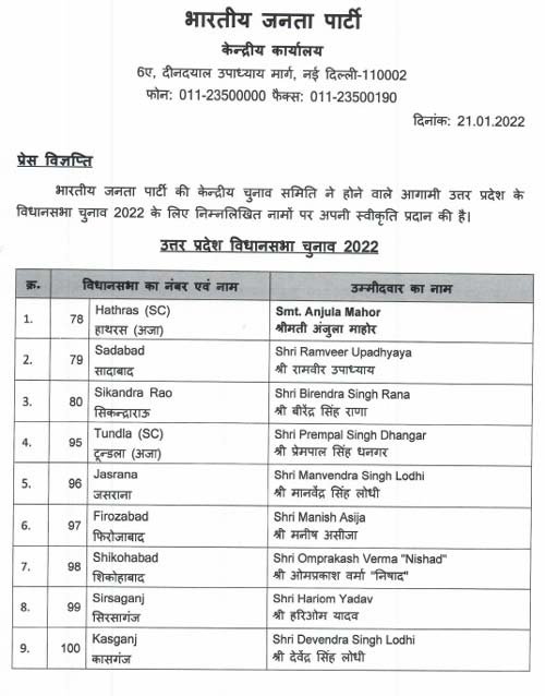 उत्तर प्रदेश विधानसभा चुनाव के लिए भारतीय जनता पार्टी ने अपने प्रत्याशियों की तीसरी लिस्ट जारी कर दी है। शुक्रवार शाम को जारी की गई इस लिस्ट में 85 उम्मीदवारों के नामों का एलान किया गया है।