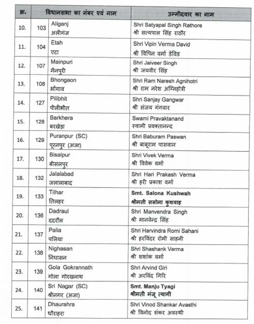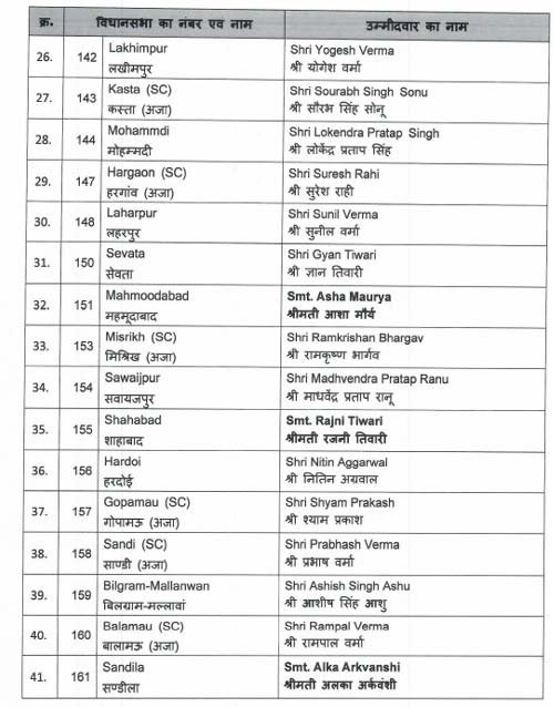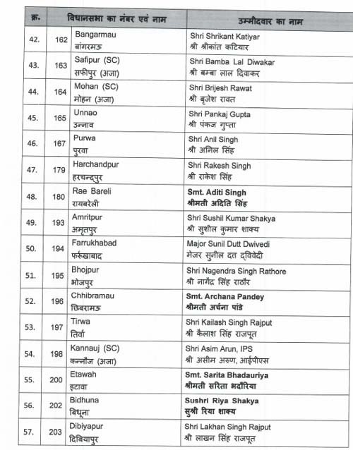 वहीं तीसरी लिस्ट में पार्टी ने हाल ही में विधानसभा उपाध्यक्ष के पद और समाजवादी पार्टी से इस्तीफा देकर बीजेपी में आने वाले नितिन अग्रवाल को हरदोई सदर से पार्टी ने प्रत्याशी बनाया है। वहीं बिधूना से रिया शाक्य को टिकट दिया है।