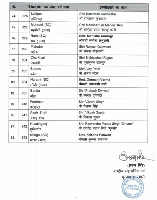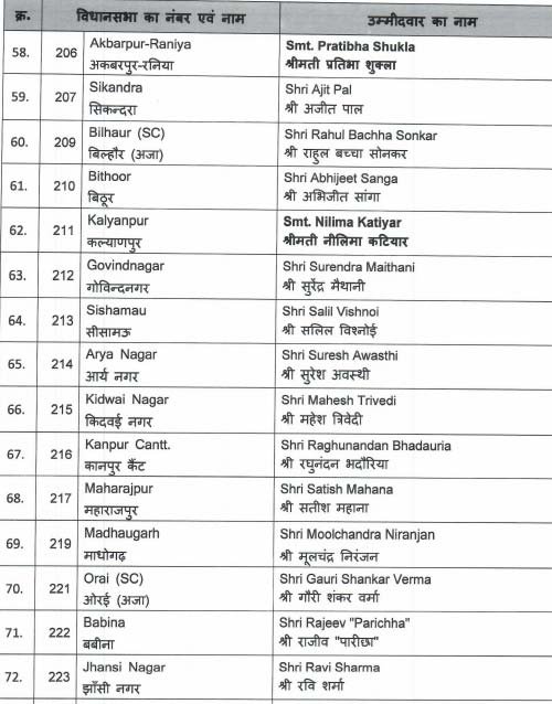 बता दें कि कानपुर के पूर्व पुलिस कमिश्नर असीम अरुण को कन्नौज से, अदिति सिंह को रायबरेली से, हरदोई से नितिन अग्रवाल को, बिधूना से रिया शाक्य को टिकट दिया गया है। 85 उम्मीदवारों में 15 महिलाएं हैं। असीम अरुण कानपुर के पुलिस कमिश्नर रह चुके हैं। रामवीर उपाध्याय को सादाबाद से टिकट दिया गया है। हरिओम यादव को सिरसागंज से उम्मीदवार बनाया गया है।