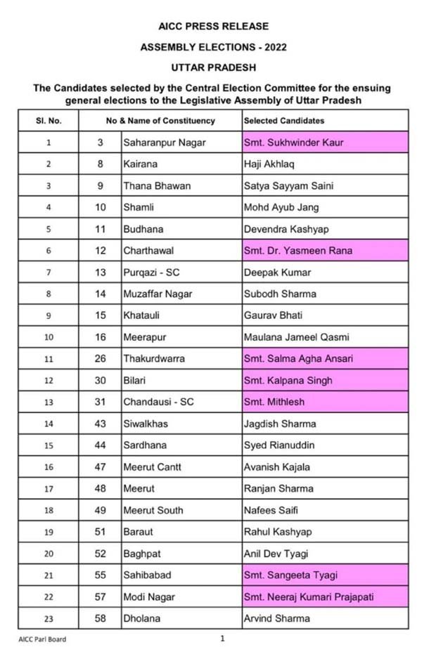 उत्तर प्रदेश विधानसभा सभा चुनाव के लिए कांग्रेस पार्टी ने आज अपनी दूसरी लिस्ट भी जारी कर दी है। जारी की गई 41 प्रत्याशियों की सूची में 16 महिला उम्मीदवारों के नाम हैं। मेरठ के हस्तिानापुर से अर्चना गौतम तथा किठौर के बबीता गुर्जर के बाद कांग्रेस ने दूसरी सूची में सिवालखास से जगदीश शर्मा, सरधना से सईद रियानुद्दीन, मेरठ शहर से रंजन शर्मा, मेरठ दक्षिण से नफीस सैफी तथा मेरठ कैंट से अवनीश काजला को प्रत्याशी बनाया है। रंजन शर्मा वार्ड 43 के पार्षद हैं। शामली से अय्यूब जंग, कैराना से हाजी अखलाक एवं थानाभवन से सत्यम सैनी को प्रत्याशी बनाया है। यहां हम आपको बता दें कि कांग्रेस न 14 जनवरी को अपने 125 उम्मीदवारों की पहली सूची जारी की थी।