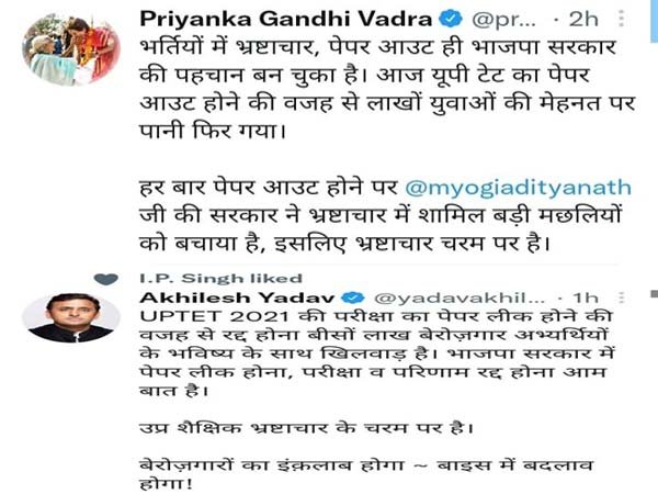 समाजवादी पार्टी के मुखिया अखिलेश यादव ने भी ट्वीट कर सरकार को घेरा है। उन्होंने कहा कि पेपर लीक के कारण परीक्षा का रद होने 20 लाख बेरोजगार अभ्यर्थियों के भविष्य से खिलवाड़ है। उन्होंने नारा देते हुए लिखा, ‘बेरोजगारों का इंकलाब होगा, बाइस में बदलाव होगा। यूपीटीईटी की परीक्षा का पेपर लीक होने की वजह से रद्द होना 20 लाख बेरोजगार अभ्यर्थियों के भविष्य के साथ खिलवाड़ है। भाजपा सरकार में पेपर लीक होना, परीक्षा व परिणाम रद होना आम बात है।