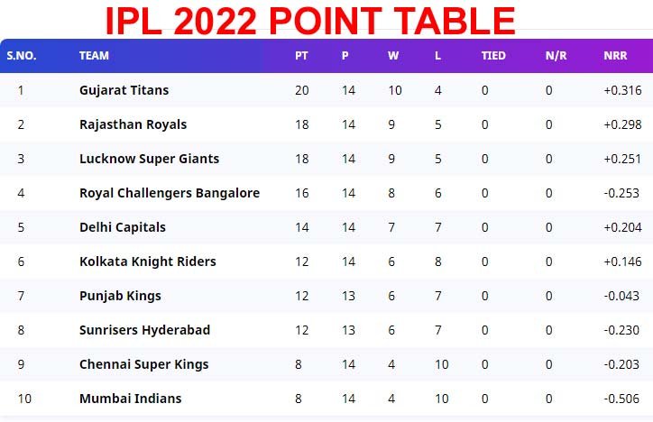 इसके साथ ही अब आईपीएल 2022 की प्लेऑफ की चार टीमें तय हो गई हैं। 14 मैचों में 20 अंकों के साथ आईपीएल की नई फ्रेंचाइजी गुजरात टाइटंस टॉप यानी नंबर 1 पायदान पर है। जबकि राजस्थान रॉयल्स 18 अंकों के साथ दूसरे स्थान पर है। वहीँ लखनऊ सुपर जायंट्स के भी 18 अंक है परन्तु कम औसत के चलते वह तीसरी पायदान पर है। प्लेऑफ में पहुंचने वाली चौथी टीम रॉयल चैलेंजर्स बैंगलोर है। जिसके 14 मैचों में 16 अंक है। वहीँ 5 बार की आईपीएल चैम्पियन मुंबई इंडियंस इस बार सबसे आखिरी पायदान पर है।