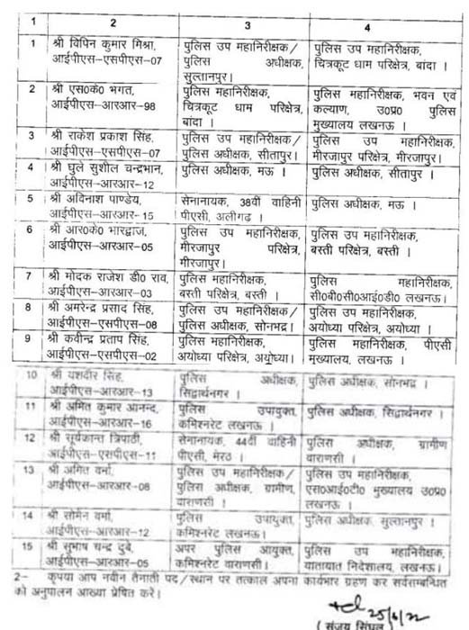 सरकार की तरफ से ये तबादले शुक्रवार की देर रात किए गए हैं जिसके मुताबिक, मऊ, सीतापुर, सोनभद्र, सिद्धार्थ नगर और सुल्तानपुर जिलों के पुलिस कप्तान बदले गए हैं। अपर पुलिस आयुक्त वाराणसी सुभाष चन्द्र दुबे को अब लखनऊ पुलिस कमिश्नरेट की नई जिम्मेदारी मिली है। सुलतानपुर में तैनात विपिन कुमार मिश्रा की तैनाती चित्रकूट धाम परिक्षेत्र बांदा में डीआईजी के रूप में कर दी गई है।