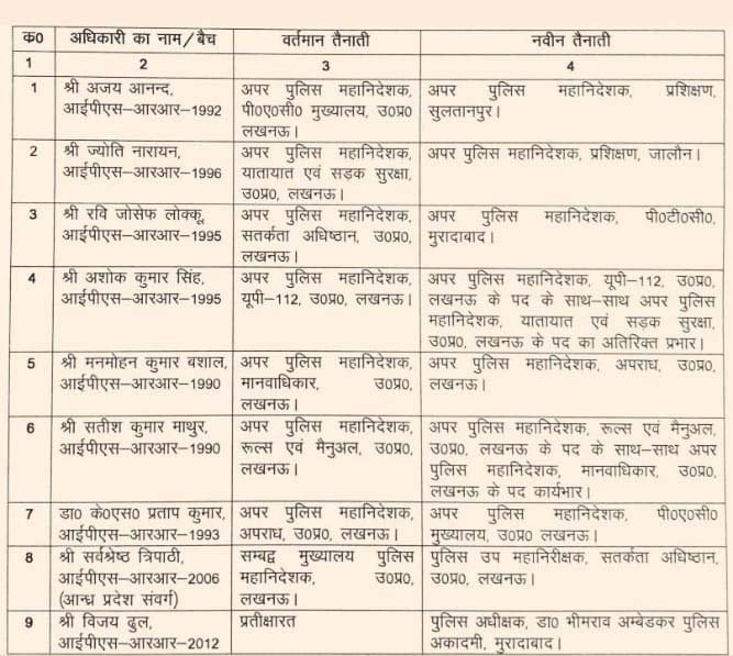 आईपीएस अजय आनंद को एडीजी प्रशिक्षण सुलतानपुर, ज्योति नारायण एडीजी प्रशिक्षण जालौन, रवि जोसेफ एडीजी पीटीसी मुरादाबाद, अशोक कुमार सिंह एडीजी यूपी 112, अशोक कुमार सिंह को एडीजी यातायात एवं सड़क सुरक्षा का अतिरिक्त प्रभार, मनमोहन कुमार एडीजी अपराध, सतीश कुमार माथुर एडीजी रूल्स एवं मैनुअल, सतीश कुमार माथुर को एडीजी मानवाधिकार का अतिरिक्त प्रभार, केएस प्रताप कुमार एडीजी पीएसी मुख्यालय लखनऊ, सर्वश्रेष्ठ त्रिपाठी डीआईजी सतर्कता अधिष्ठान लखनऊ, विजय ढुल एसपी डॉ. भीमराव आंबेडकर पुलिस अकादमी मुरादाबाद बनाया गया है।