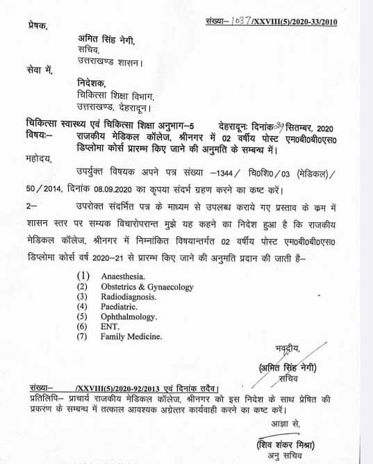 प्रदेश सरकार ने राजकीय मेडिकल कॉलेज श्रीनगर में 2 वर्षीय पोस्ट MBBS डिप्लोमा कोर्स की मंजूरी दे दी है। राज्य के सचिव स्वास्थ्य अमित सिंह नेगी ने इसके लिए जारी आदेश किया है। आदेश में कहा गया है कि वर्ष 2020-21 से राजकीय मेडिकल कॉलेज श्रीनगर में निम्न विषयों में 02 वर्षीय पोस्ट MBBS डिप्लोमा कोर्स शुरू करने की अनुमति दी जाती है।