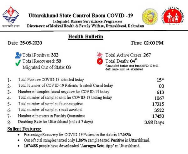 देहरादून : बीते कुछ दिनों से उत्तराखंड में कोरोना वायरस का संक्रमण लगातार बढ़ता जा रहा है. स्वास्थ्य विभाग द्वारा आज दोपहर को जारी हेल्थ बुलेटिन में राज्य में 15 नए लोगों में कोरोना वायरस की पुष्टि हुई है. जिसके बाद अब राज्य में कोरोना के मरीजों का आंकड़ा बढ़कर 332 पहुँच गया है. अभी अभी प्राप्त रिपोर्ट में जिन 15 लोगों में कोरोना की पुष्टि हुई है उनमे से 04 मरीज उधमसिंह नगर जनपद के, 02 चमोली जिले के, 01 देहरादून का, 03 हरिद्वार के, 03 पौड़ी गढ़वाल के, 01 टिहरी गढ़वाल का तथा 01 पिथोरागढ़ का रहने वाला है.