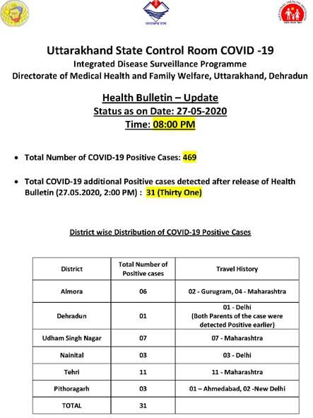 Coronavirus Update uttarakhand : उत्तराखंड में कोरोना वायरस संक्रमण के मामले की रफ़्तार रुकने का नाम नहीं ले रही है. स्वास्थ्य विभाग द्वारा आज देश शाम जारी रिपोर्ट में कोरोना के 31 नए मामलों की पुष्टि हुई है. इससे पहले आज दोपहर 2 बजे जारी हेल्थ बुलेटिन के अनुसार राज्य के आज 38 कोरोना संक्रमित मरीज मिले थे। जिसके बाद बुधवार को उत्तराखंड में कोरोना पॉजिटिव मरीजों का आंकड़ा 69 पहुँच गया है. जबकि अब तक प्रदेश में कोरोना संक्रमित मरीजों की कुल संख्या 469 हो गई है. इससे पहले मंगलवार को भी 51 लोगों में कोरोना की पुष्टि की गई थी। अब तक कुल 79 लोग ठीक हो चुके हैं. जबकि 4 लोगों की मौत हो चुकी है.