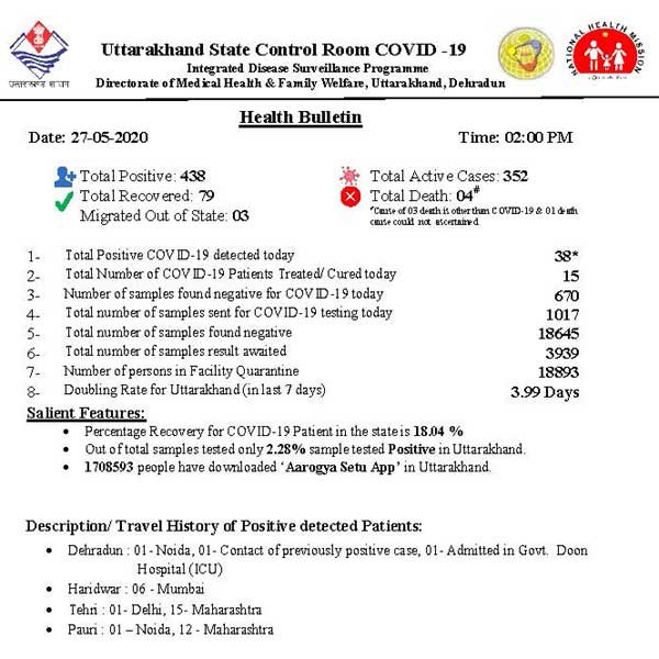 Coronavirus Update uttarakhand : उत्तराखंड में कोरोना वायरस संक्रमण के मामले तेजी से बढ़ रहे हैं। इसका अंदाजा इसी बात से लगाया जा सकता है कि पिछले तीन दिन के अंतराल में राज्य में 200 से ज्यादा कोरोना पॉजिटिव मिल चुके हैं। स्वास्थ्य विभाग द्वारा आज दोपहर में जारी हेल्थ बुलेटिन के अनुसार राज्य के आज 38 नए कोरोना संक्रमित मरीज मिले हैं। जिसके बाद अब प्रदेश में कोरोना संक्रमित मरीजों की संख्या 438 हो गई है. इससे पहले मंगलवार दोपहर को जारी हेल्थ बुलेटिन में 51 लोगों में कोरोना की पुष्टि की गई थी। इसके अलावा आज 15 लोग स्वस्थ होकर घर लौटे हैं. अब तक कुल 79 लोग ठीक हो चुके हैं.