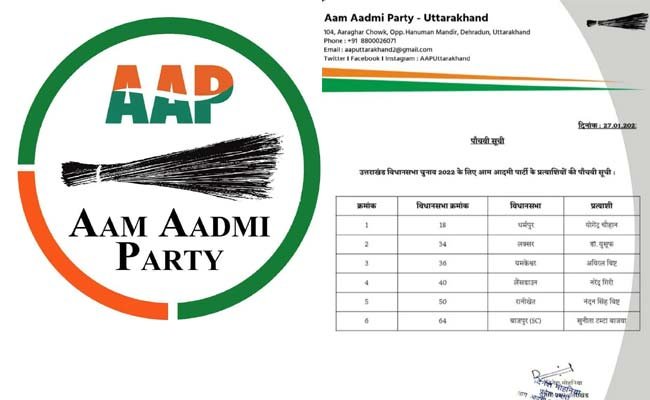 Uttarakhand Assembly Elections 2022: उत्तराखंड में होने जा रहे आगामी विधानसभा चुनावों को लेकर आज आम आदमी पार्टी ने अपने प्रत्याशियों की पांचवीं सूची जारी कर दी है। पांचवीं सूची में कुल 6 लोगों के में नाम है। आम आदमी पार्टी ने सुनीता बाजवा को बाजपुर से टिकट दिया है। अब तक पार्टी 67 प्रत्याशियों के नामों की घोषणा कर चुकी है। अब तीन सीटों पर प्रत्याशी घोषित करना शेष रह गया है। आम आदमी पार्टी प्रभारी दिनेश मोहनिया ने ट्वीट कर यह जानकारी दी।