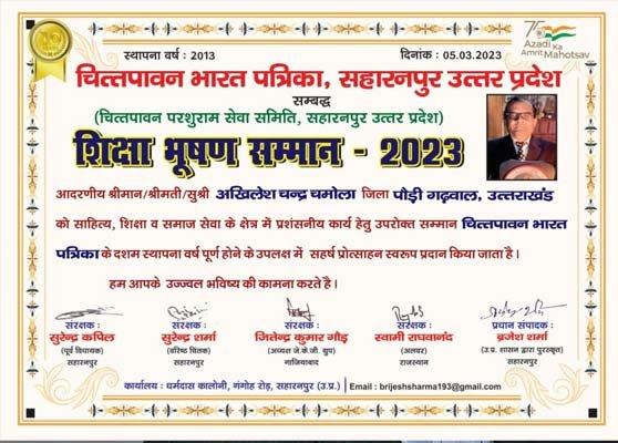 जनपद पौड़ी गढ़वाल विकास खंड खिर्सू के राजकीय इन्टर कॉलेज सुमाडी में हिन्दी अध्यापक के पद पर कार्यरत अखिलेश चन्द्र चमोला शिक्षा भूषण सम्मान-2023 से सम्मानित हुए। उन्हें यह सम्मान चित्त पावन भारत पत्रिका सहारनपुर उत्तर प्रदेश की समिति ने एक भव्य आयोजित कार्यक्रम में दिया। यह कार्यक्रम पत्रिका के दस वर्ष पूर्ण होने के पुनीत सुअवसर पर आयोजित किया गया। जिसमें चयन समिति द्वारा विभिन्न राज्यों के साहित्य कारों, पर्यावरण विद, समाज सेवी, शिक्षक विदों का चयन अकादमिक परिषद द्वारा किया गया।