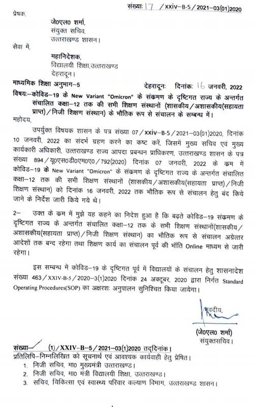 देश में तेजी के साथ बढ़ रहे कोरोना मामलों को देखते हुए उत्तराखंड शासन ने 12वीं कक्षा तक के सभी सरकारी व निजी स्कूलों को अगले आदेश तक बंद करने का आदेश जारी किया है। इससे पहले 16 जनवरी तक सभी स्कूल कॉलेज बंद थे। रविवार को उत्तराखंड के संयुक्त सचिव जेएल शर्मा ने इसके शासनादेश जारी किए हैं। फिलहाल क्लास ऑनलाइन के माध्यम से संचालित रहेंगी।