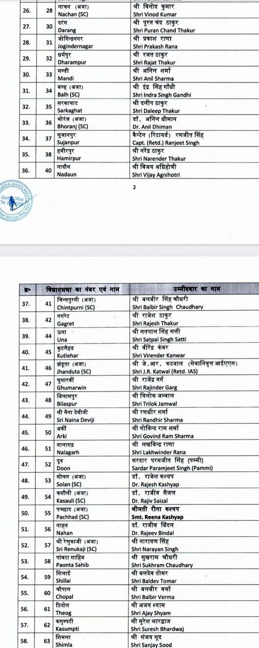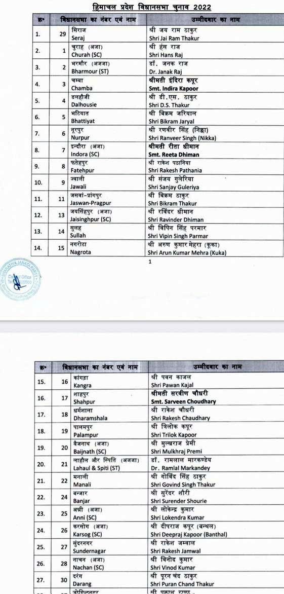 हिमाचल प्रदेश विधानसभा चुनाव के लिए भाजपा ने 62 प्रत्याशियों के नामों का किया एलान