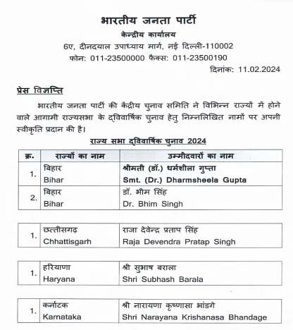 इसके अलावा बिहार से धर्मशीला गुप्ता और डॉ भीम सिंह को उम्मीदवार बनाया गया है। छत्तीसगढ़ से राजा देवेंद्र प्रताप सिंह को उम्मीदवार बनाया है। हरियाणा की एक सीट पर सुभाष बराला प्रत्याशी बनाए गए हैं। कर्नाटक की एक सीट पर नारायणा कृष्णासा भांडगे बीजेपी के उम्मीदवार होंगे। और पश्चिम बंगाल से सामिक भट्टाचार्य पार्टी के प्रत्याशी होंगे