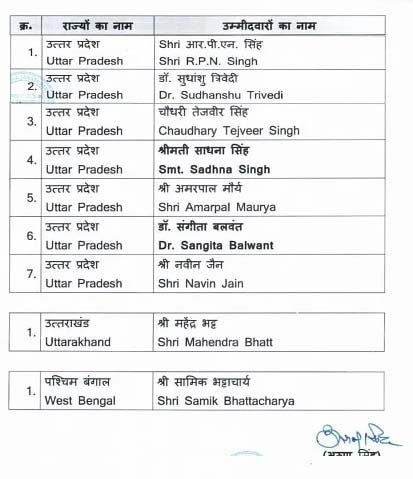 Rajya Sabha Election: भारतीय जनता पार्टी ने राज्यसभा चुनाव के लिए अपने प्रत्याशियों की सूची जारी कर दी है। बीजेपी ने उत्तर प्रदेश की 7 सीटों के लिए सुधांशु त्रिवेदी, आरपीएन सिंह, तेजवीर सिंह, साधना सिंह, संगीता बलवंत, नवीन जैन और अमरपाल मौर्या को प्रत्याशी बनाया गया है। वहीँ उत्तराखंड से प्रदेश अध्यक्ष महेंद्र भट्ट को उम्मीदवार घोषित किया गया।