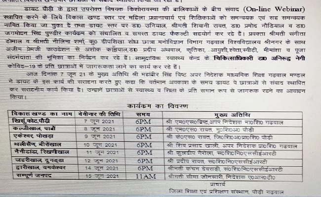 वर्तमान समय में सभी शैक्षणिक संस्थाएं बंद हैं। ऐसे समय बच्चों को कोविड-19 के प्रति जागरूक करने तथा महिला सशक्तिकरण एवं बालिका शिक्षा की महत्ता के मद्देनजर अपने दायित्व को समझते हुए डायट प्रवक्ता एवं कार्यक्रम समन्वयक डॉ नारायण प्रसाद उनियाल ने प्राचार्य डॉ. महावीर कलेठा के मार्गदर्शन में डाइट चढ़ीगांव पौड़ी एवं एपीएफ पौड़ी के सहयोग से 7 जून 2021 से उपरोक्त विषय पर किशोर बालिकाओं के साथ संवाद स्थापित करने हेतु विकासखंड वार ऑनलाइन वेबीनार प्रारंभ किया है। जोकि आगामी 15 जून तक चलेगा।