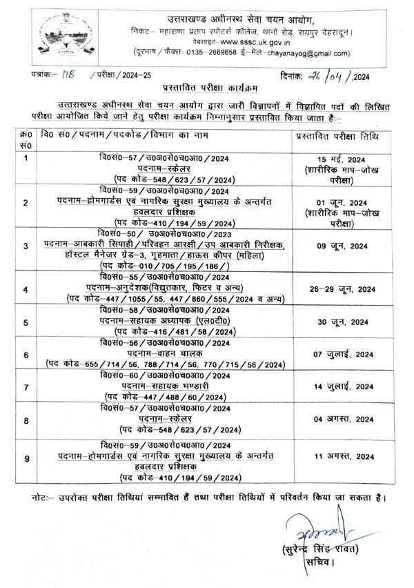 UKSSSC exam calendar: उत्तराखंड अधीनस्थ सेवा चयन आयोग ने समूह-ग की 9 भर्ती परीक्षाओं का कैलेंडर जारी कर दिया है। ये भर्ती परीक्षाएं इस साल मई से अगस्त के बीच में कराई जाएंगी। आयोग के सचिव सुरेंद्र सिंह रावत की ओर से जारी कैलेंडर में बताया गया है कि वन विभाग स्केलर भर्ती के लिए शारीरिक मापजोख परीक्षा 15 मई को होगी।