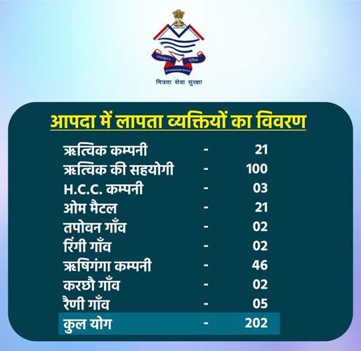 रविवार को ग्लेशियर टूटने के कारण ऋषिगंगा पावर प्रोजेक्ट और तपोवन-विष्णुगाड़ जल विद्युत परियोजना ध्वस्त हो गई थी। तपोवन-विष्णुगाड प्रोजेक्ट की दूसरी सुरंग में 30 से 35 व्यक्ति फंसे हैं। टनल में मलबा भरे होने के कारण उनके रेस्क्यू में दिक्कत आ रही हैं, ऋषिगंगा नदी और धौलीगंगा नदी के उफान में इन दोनों प्रोजेक्टों में काम करने वाले कई श्रमिक व स्थानीय लोग लापता है, जिनकी तलाश में एसडीआरएफ की 11 टीम जुटी हैं, दो टीम रैणी, चार टीम तपोवन, दो टीम जोशीमठ व तीन टीम श्रीनगर में तलाशी अभियान चला रही हैं। एयरफोर्स के चार हेलीकाप्टरों की भी मदद ली जा रही है। सोमवार को राहत-बचाव के साथ लापता व्यक्तियों के तलाशी में एसडीआरएफ के 70 जवान, एनडीआरएफ के 129 जवान, आइटीबीपी के 425 जवान, एसएसबी की एक टीम, सेना के 124 जवान, आर्मी की दो मेडिकल टीम और स्वास्थ्य विभाग की दो टीमें लगी हैं।