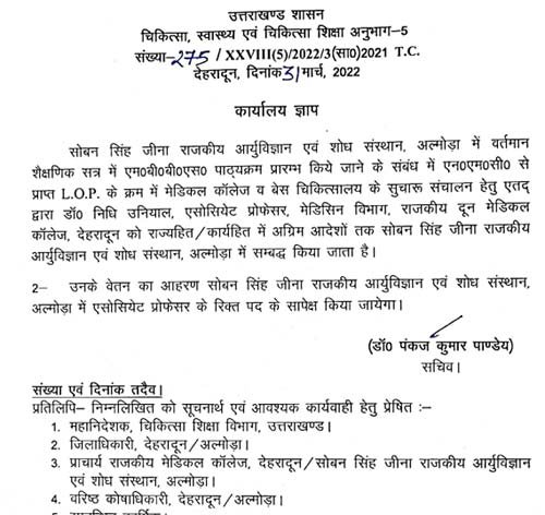 देहरादून: मुख्यमंत्री पुष्कर सिंह धामी ने समाचार पत्रों और सोशल मीडिया में दून मेडिकल कॉलेज चिकित्सालय की वरिष्ठ महिला चिकित्सक डॉ निधि उनियाल के अल्मोड़ा मेडिकल कालेज संबद्धीकरण एवं उनके साथ हुए दुर्व्यवहार की खबरों का संज्ञान लेते हुए तत्काल प्रभाव से इस संबद्धीकरण आदेश को निरस्त करने के निर्देश दिए हैं। मुख्यमंत्री पुष्कर सिंह धामी ने इस मामले की उच्च स्तरीय जांच के लिए मुख्य सचिव डॉ एसएस संधू को निर्देश भी दिए हैं। मुख्यमंत्री धामी के निर्देश पर मुख्य सचिव डॉ संधू ने अपर मुख्य सचिव श्रीमती मनीषा पवार को उपरोक्त प्रकरण की तथ्यात्मक जांच ( fact finding enquiry) करते हुए अपनी रिपोर्ट देने के निर्देश दिए हैं।