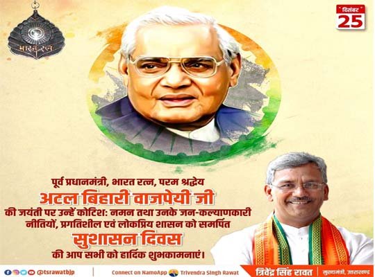 मुख्यमंत्री त्रिवेन्द्र सिंह रावत ने पूर्व प्रधानमंत्री भारत रत्न स्वर्गीय अटल बिहारी वाजपेयी की जयंती पर उन्हें श्रद्धांजलि अर्पित की है। मुख्यमंत्री ने कहा कि भारत रत्न पूर्व प्रधानमंत्री स्वर्गीय अटल बिहारी वाजपेयी जी की जयंती को सुशासन दिवस के रूप मे मनाया जा रहा है। श्रद्धेय वाजपेयी जी ने ही दशकों से चले आ रहे उत्तराखण्ड राज्य निर्माण के संघर्ष का सम्मान करते हुए अलग राज्य का सपना साकार किया था।