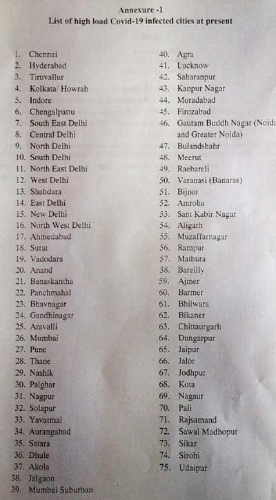 कोविड-19 से अत्यधिक प्रभावित 75 शहरों में चेन्नई, हैदराबाद, तिरुवल्लुर, कोलकाता/हावड़ा, इंदौर, चेंगलपट्टु, साउथ ईस्ट दिल्ली, मध्य दिल्ली, उत्तरी दिल्ली, दक्षिणी दिल्ली, नार्थ ईस्ट दिल्ली, पश्चिम दिल्ली, शाहदरा, पूर्वी दिल्ली, नई दिल्ली, उत्तर पश्चिम दिल्ली, अहमदाबाद, सूरत, वडोदरा, आनंद, बनासकांठा, पंचमहल, भावनगर, गांधीनगर, अरावली, मुंबई, पुणे, ठाणे, नासिक, पालघर, नागपुर, सोलापुर, यवतमाल, औरंगाबाद, सतारा, धुले, अकोला, जलगाँव, मुंबई उपनगर, आगरा, लखनऊ, सहारनपुर, कानपुर नगर, मुरादाबाद, फिरोजाबाद, गौतम बुद्ध नगर (नोएडा और ग्रेटर नोएडा), बुलंदशहर, मेरठ, रायबरेली, वाराणसी (बनारस), बिजनौर, अमरोहा, संत कबीर नगर, अलीगढ़, मुजफ्फरनगर, रामपुर, मथुरा, बरेली, अजमेर, बाड़मेर, भीलवाड़ा, बीकानेर, चित्तौड़गढ़, डूंगरपुर, जयपुर, जालोर, जोधपुर, कोटा, नागौर, पाली, राजसमंद सवाई माधोपुर, सीकर, सिरोही व उदयपुर शामिल हैं।