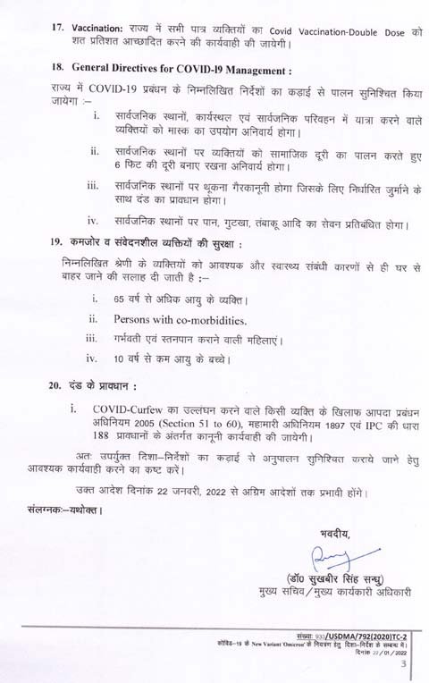 बता दें कि राज्य में लागू कोविड प्रतिबंध की अवधि शनिवार को खत्म हो गई। इसे देखते हुए उच्च स्तर पर हुए मंथन के बाद शासन ने प्रतिबंध को 31 जनवरी तक बढ़ाने का निर्णय लिया। तय किया गया है कि प्रदेश में नाइट कर्फ्यू रात 10 से सुबह 06 बजे तक प्रभावी रहेगा। इसके साथ ही राज्य में 31 जनवरी तक आंगनबाड़ी से लेकर 12वीं तक के सभी सरकारी, सहायता प्राप्त अशासकीय और निजी शिक्षण संस्थान बंद रहेंगे। इस दौरान आनलाइन पढ़ाई जारी रहेगी।