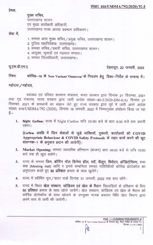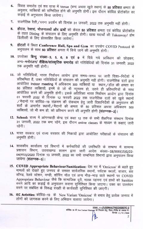 स्वीमिंग पूल, वाटर पार्क 31 जनवरी तक बंद रहेंगे। मनोरंजन, शैक्षिक व सांस्कृतिक समारोह भी नहीं होंगे। जिम, शापिंग माल, सिनेमा हाल, होटल, रेस्तरां, ढाबे, स्पा, सैलून, थिएटर, आडिटोरियम, सभाकक्ष, खेल संस्थान, स्टेडियम व खेल मैदान 50 प्रतिशत क्षमता के साथ खुलेंगे। विवाह समारोह में स्थल के 50 प्रतिशत क्षमता के साथ व्यक्तियों को शामिल होने की अनुमति होगी।