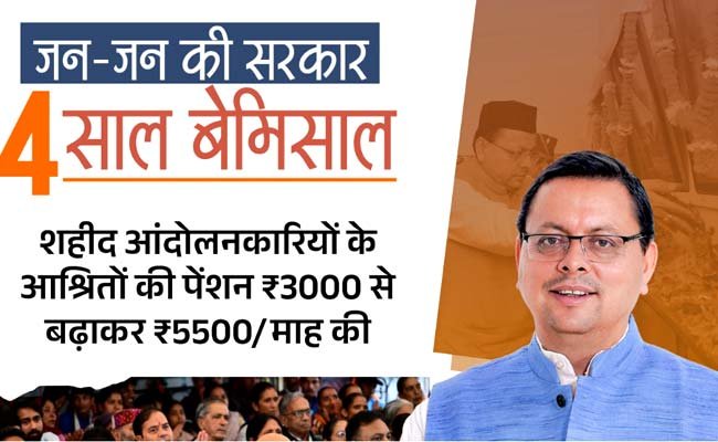 देहरादून: उत्तराखंड में मुख्यमंत्री पुष्कर सिंह धामी के नेतृत्व में राज्य सरकार ने सोमवार को अपने चार वर्ष का कार्यकाल सफलतापूर्वक पूर्ण कर लिया है। यह 4 वर्ष विभिन्न क्षेत्रों में उपलब्धियों से भरा रहा। इस अवसर पर प्रदेश भर में विभिन्न कार्यक्रमों का आयोजन भी किया गया, वहीं सोशल मीडिया पर भी लोगों ने सरकार की उपलब्धियों की सराहना की।