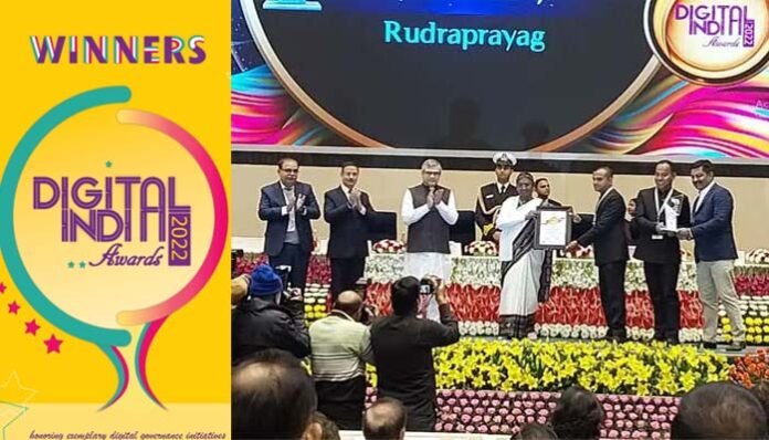 Digital India Awards 2022 :  उत्तराखंड के लिए गौरवान्वित होने वाली खबर है। उत्तराखंड के रुद्रप्रयाग जिले ने राष्ट्रीय स्तर पर डिजिटल इंडिया अवॉर्ड्स 2022 में सिल्वर मेडल जीता है। चारधाम यात्रा मार्ग पर प्लास्टिक उन्मूलन के लिए डिजिटल डिपॉजिट रिफंड सिस्टम (DRS) में जनपद रुद्रप्रयाग को राष्ट्रीय पुरस्कार से सम्मानित किया गया है। शनिवार को नई दिल्ली के विज्ञानं भवन में आयोजित कार्यक्रम में देश की राष्ट्रपति द्रौपदी मुर्मू ने रुद्रप्रयाग के जिलाधिकारी मयूर दीक्षित और उपजिलाधिकारी ऊखीमठ जितेंद्र वर्मा को पुरस्कार देकर किया सम्मानित किया।