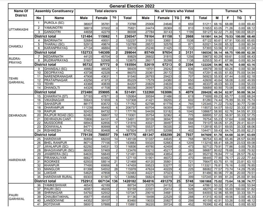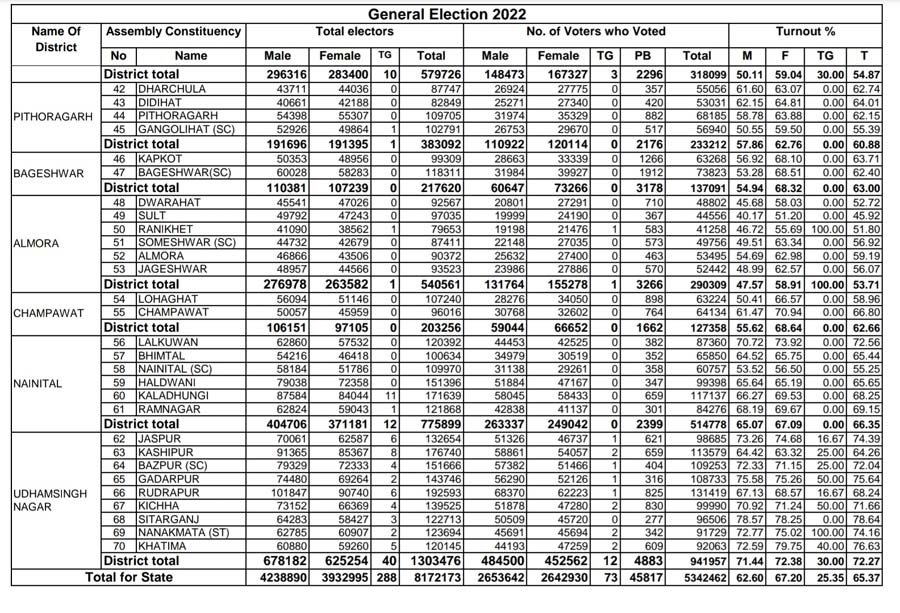 इस बार उत्तराखंड में वर्ष 2017 में हुए मतदान से मामूली कम मतदान हुआ है। 2017 विधानसभा चुनाव में जहाँ राज्य में 65.64% मतदान हुआ था। वहीँ इस बार 65.37 प्रतिशत मतदान हुआ। उत्तराखंड में इस बार महिलाओं ने पुरुषों से ज्यादा मतदान किया। निर्वाचन आयोग द्वारा जारी आंकड़ों के मुताबिक राज्य में कुल 62.60 फीसदी पुरुष मतदाताओं ने वोटिंग की। जबकि 67.20 फीसदी महिलाओं ने अपने मताधिकार का प्रयोग किया।