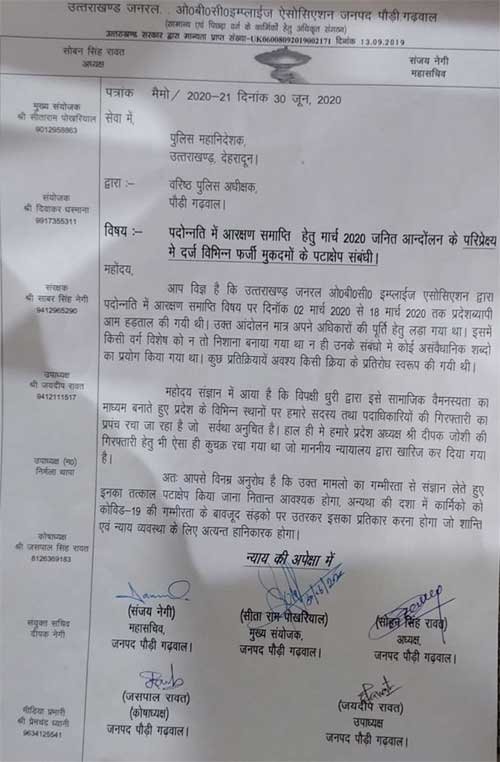 एसोसिएशन के जिलाध्यक्ष सोहन सिंह रावत एवं मुख्य संयोजक सीताराम पोखरियाल ने कहा कि इस वर्ष 2 से 18 मार्च तक उत्तराखंड जनरल ओबीसी इम्प्लाइज एसोसिएशन के नेतृत्व में पूरे प्रदेश में पदोन्नति में आरक्षण को समाप्त करने को लेकर हड़ताल की गई थी। उक्त आन्दोलन केवल अपने अधिकारों की पूर्ति के लिए लड़ा गया था। इसमें किसी वर्ग विशेष को न तो निशाना बनाया गया था और न ही उनके संबंधों में कोई असंवैधानिक शब्दों का प्रयोग किया गया था। परन्तु हड़ताल के दौरान एक संगठन द्वारा जनरल ओबीसी एसोसिएशन के पदाधिकारियों की गिरफ्तारी का प्रपंच रचा गया। और एसोसिएशन के प्रदेश अध्यक्ष पर फर्जी मुकदमे दर्ज करवाए गए थे। जिसके बाद से जनरल व ओबीसी वर्ग के सभी कर्मचारियों में रोष है। उन्होंने प्रदेश अध्यक्ष पर दर्ज मुकदमों को जल्द से जल्द वापस लेने की मांग की है। साथ ही एसोसिएशन द्वारा चेतावनी दी कि यदि जल्द मुकदमे वापस नहीं लिए गए तो कोविड-19 की गंभीरता के बावजूद कर्मचारी सड़कों पर उतरकर आंदोलन करने को बाध्य होंगे। ज्ञापन देने वालों में जिलाध्यक्ष सोहन सिंह रावत एवं मुख्य संयोजक सीताराम पोखरियाल के अलावा महासंचिव संजय नेगी, कोषाध्यक्ष जसपाल रावत, उपाध्यक्ष जयदीप रावत आदि पदादिकारी शामिल थे।