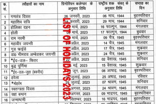 Holiday List 2023 : उत्‍तराखंड शासन ने वर्ष 2023 में छुट्टियों का कैलेंडर जारी कर दिया है। इस बार सरकार ने कैलेंडर में ईगास-बग्वाल को भी शामिल किया है। सरकार ने कुल 28 सार्वजनिक अवकाश घोषित किए हैं। सचिवालय व विधानसभा समेत ऐसे कार्यालय, जहां पांच दिवसीय सप्ताह लागू है, वहां केवल 25 सार्वजनिक अवकाश ही अनुमन्य होंगे। इस वर्ष तीन अवकाश शनिवार और तीन रविवार को पड़ रहे हैं।
