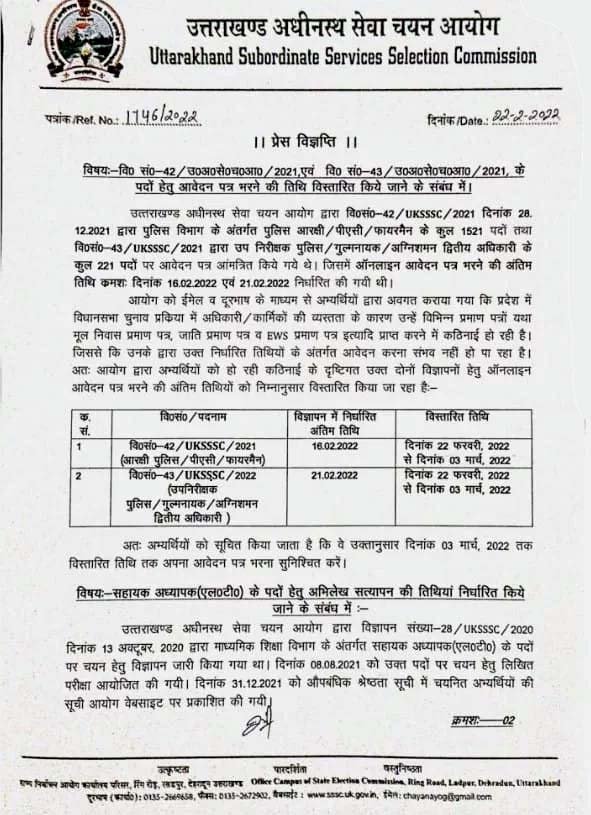 बता दें कि उत्तराखंड अधीनस्थ सेवा चयन आयोग द्वारा बीते 28 दिसम्बर 2021 को उत्तराखंड पुलिस में आरक्षी (कांस्टेबल) के 1521 रिक्त पदों तथा उप निरीक्षक, पुलिस गुल्मनायक, अग्निशमन द्वितीय अधिकारी के 221 पदों पर भर्ती का नोटिफिकेशन जारी किया गया था। जिसके अनुसार आरक्षी (कांस्टेबल) के 1521 रिक्त पदों पर आवेदन की अंतिम तिथि 16 फरवरी 2022 तथा उप निरीक्षक, पुलिस गुल्मनायक, अग्निशमन द्वितीय अधिकारी के 221 पदों के लिए आवेदन की अंतिम तिथि 21 फरवरी 2022 रखी गयी थी। अब उत्तराखंड सेवा अधीनस्थ चयन आयोग ने भर्ती की आवेदन तिथि बढाने का आदेश जारी कर दिया है। ऐसे में जो अभ्यर्थी अभी भी आवदेन करना चाहते हैं, वह 3 मार्च 2022 तक आवेदन कर भर्ती प्रक्रिया में शामिल हो सकते हैं।