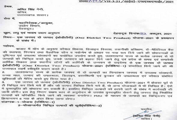 मुख्यमंत्री पुष्कर सिंह धामी के निर्देश पर उत्तराखण्ड में “एक जनपद दो उत्पाद” (वन डिस्ट्रिक्ट टू प्रॉडक्ट्स) ONE DISTRICT TWO PRODUCTS योजना संबंधी शासनादेश जारी कर दिया गया है। मुख्यमंत्री की विशेष प्राथमिकता के आधार पर राज्य सरकार द्वारा शुरू की गई इस योजना के तहत बाजार में मांग के अनुरूप कौशल विकास, डिजाइन विकास, रॉ मैटेरियल के ज़रिए नई तकनीक के आधार पर प्रत्येक जिले में दो उत्पादों का विकास किया जाएगा।