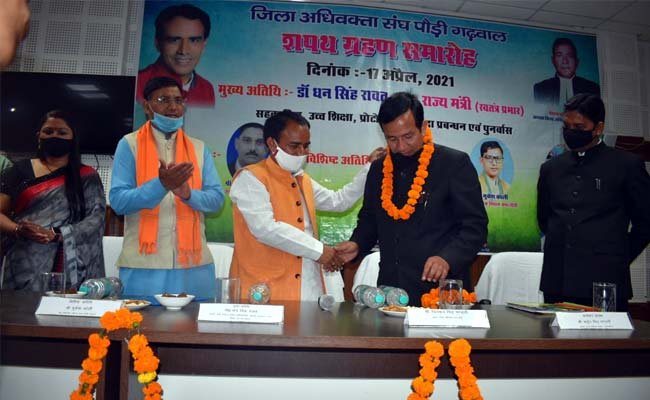 जिला पंचायत सभागार में जिला अधिवक्ता संघ के शपथ ग्रहण समारोह में मुख्य अतिथि उच्च शिक्षा मंत्री डा. धन सिंह रावत ने संघ के अध्यक्ष मेहरवान सिंह भंडारी, उपाध्यक्ष राकेश सामवेदी, सचिव आमोद नैथानी, कोषाध्यक्ष मुकेश बिष्ट, पुस्तकालयाध्यक्ष अमृता रावत व प्रवक्ता विनोद कुमार को पद व गोपनीयता की शपथ दिलाई। मंत्री डा.रावत ने कहा कि अधिवक्ता समाज में गरीब तबके को न्याय दिलाने का कार्य करते है। कहा कि कोरोना काल के समय सरकार ने अधिवक्तों के लिए कई कदम उठाए है। कहा कि वह जल्द ही जिला अधिवक्ता संघ के चेंबर का निरीक्षण भी करेंगे। वहीं विधायक पौड़ी मुकेश सिह कोली ने जिला अधिवक्ता संघ के चेंबर निर्माण के लिए 5 लाख की धनराशि देने की घोषणा की। कहा कि इससे पूर्व भी संघ को 10 लाख की धनराशि चैंबर निर्माण के लिए दी गई थी।
